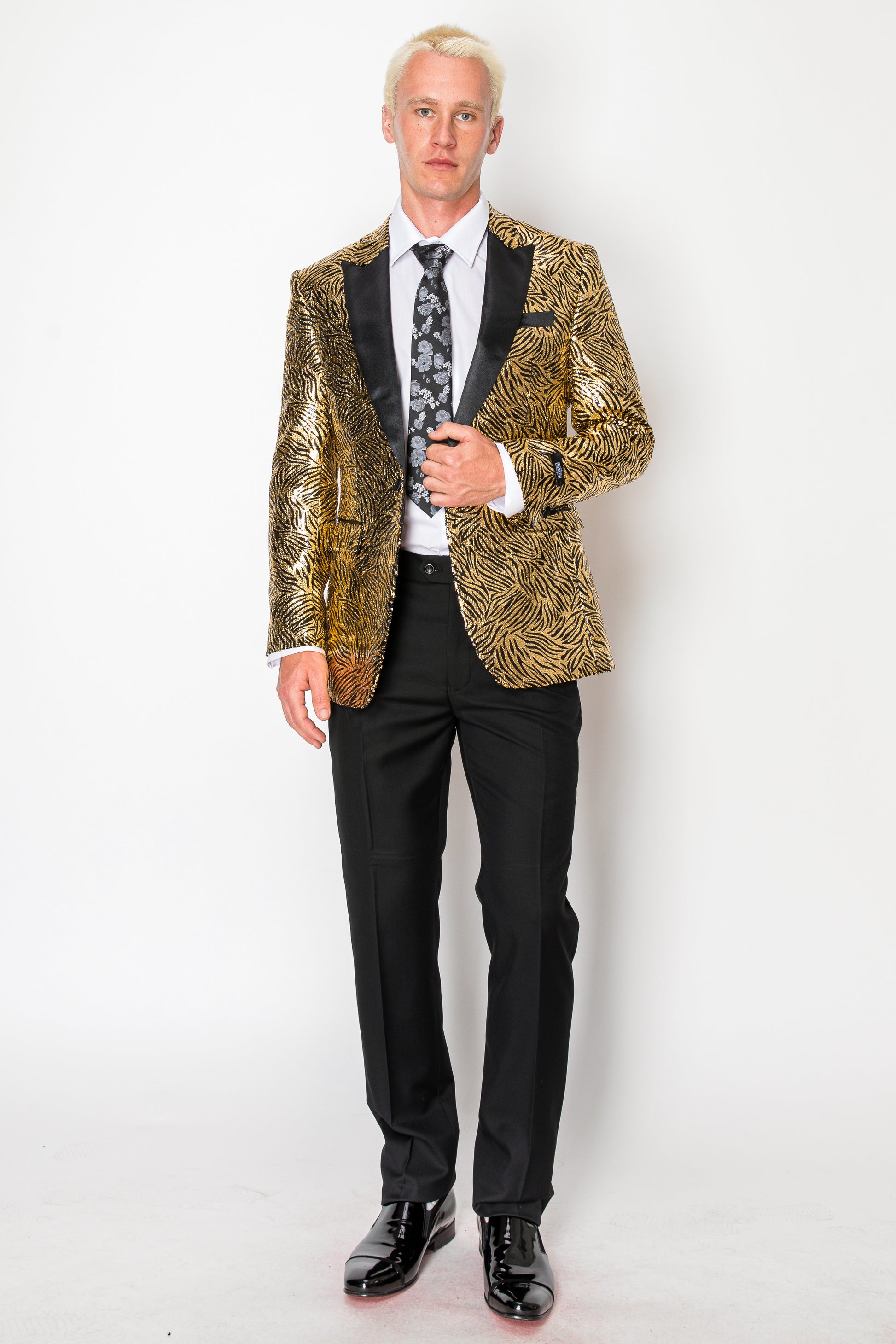 This metallic gold blazer is a luxurious and eye-catching piece that exudes sophistication and style. The subtle zebra pattern adds an elegant touch to the vibrant gold fabric, creating a unique and fashionable look. The blazer's shiny texture and sharp black lapels further enhance its overall appeal, making it a standout piece for any formal occasion.