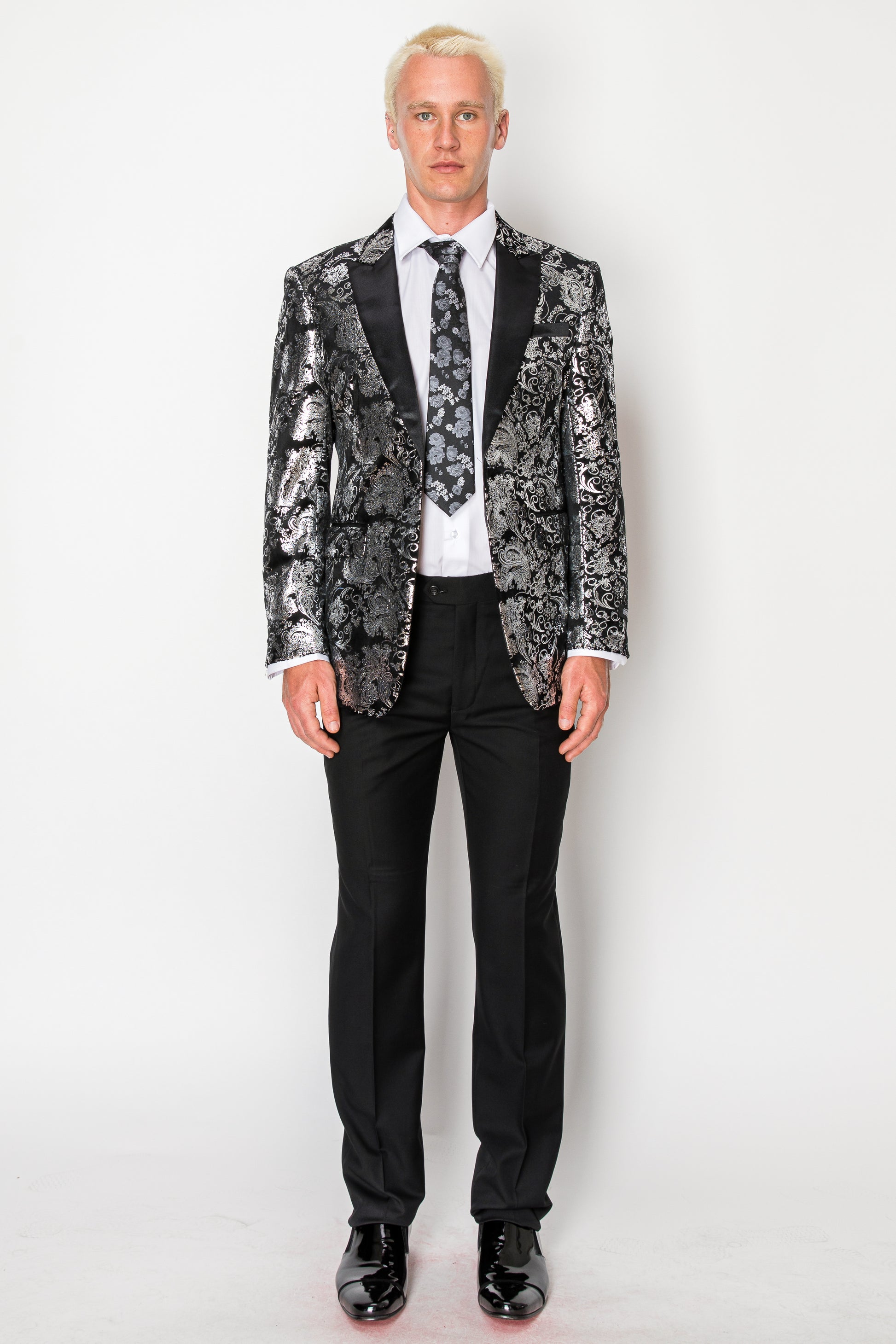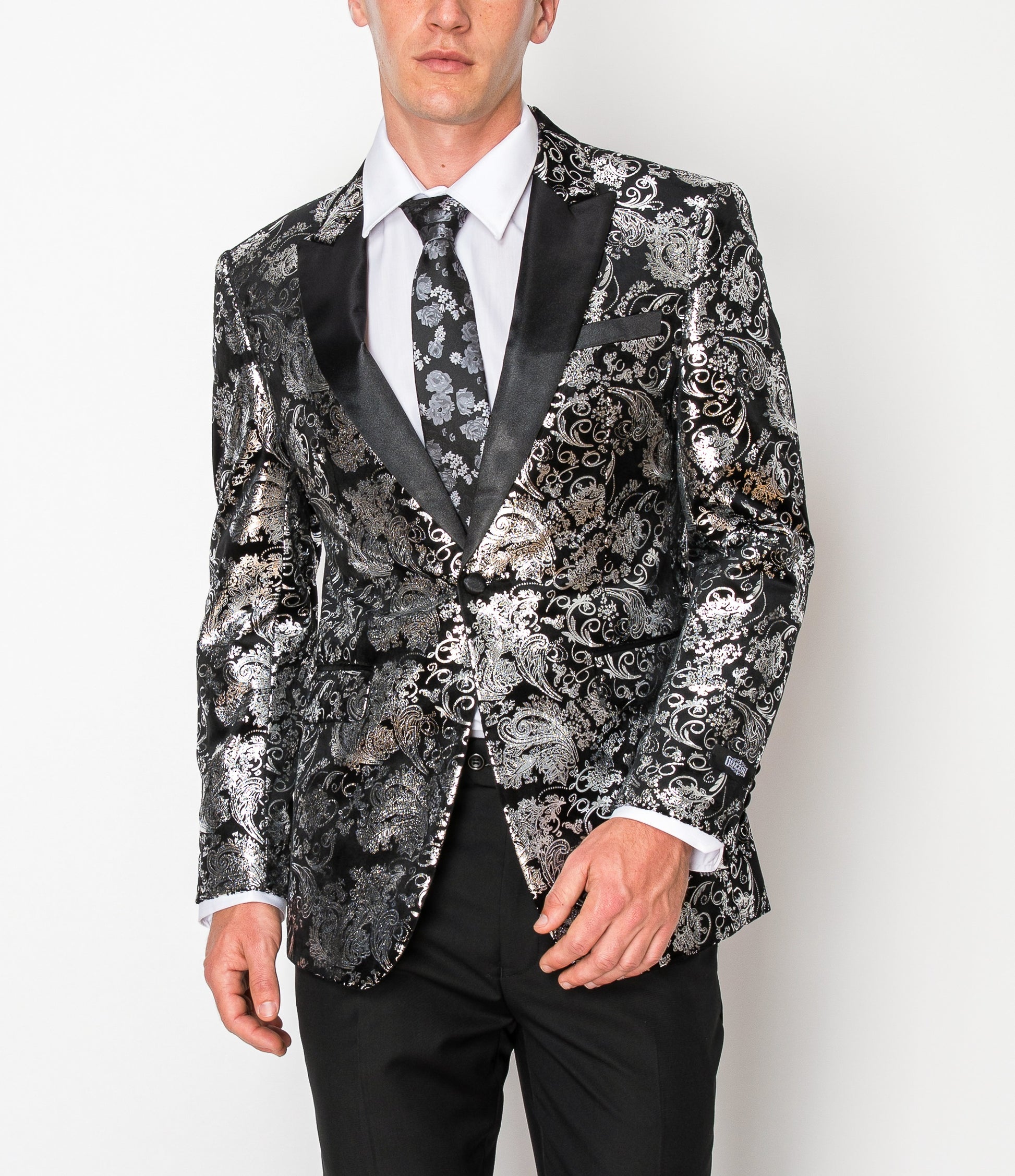 This metallic silver blazer is a luxurious and eye-catching piece that exudes sophistication and style. The subtle floral and paisley pattern adds an elegant touch to the vibrant silver fabric, creating a unique and fashionable look. The blazer's shiny texture and sharp black lapels further enhance its overall appeal, making it a standout piece for any formal occasion.